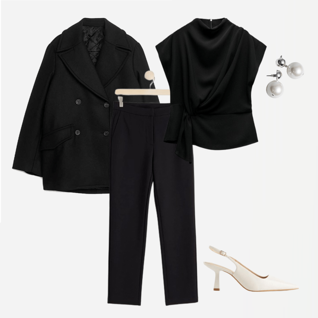 Kåpe fra Arket, bukse, topp (zara-kode 2267572), pumps fra HM, øredobber